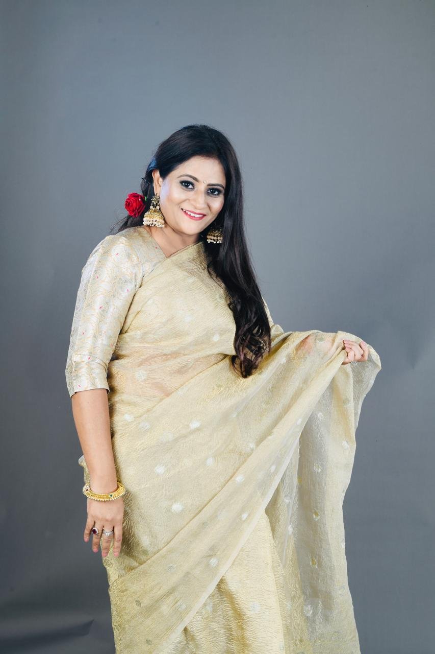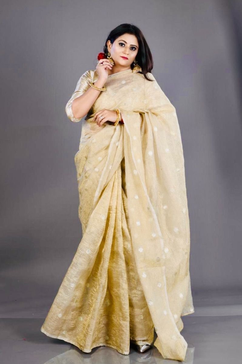 – Shine bright in this stunning gold crushed tissue saree.
