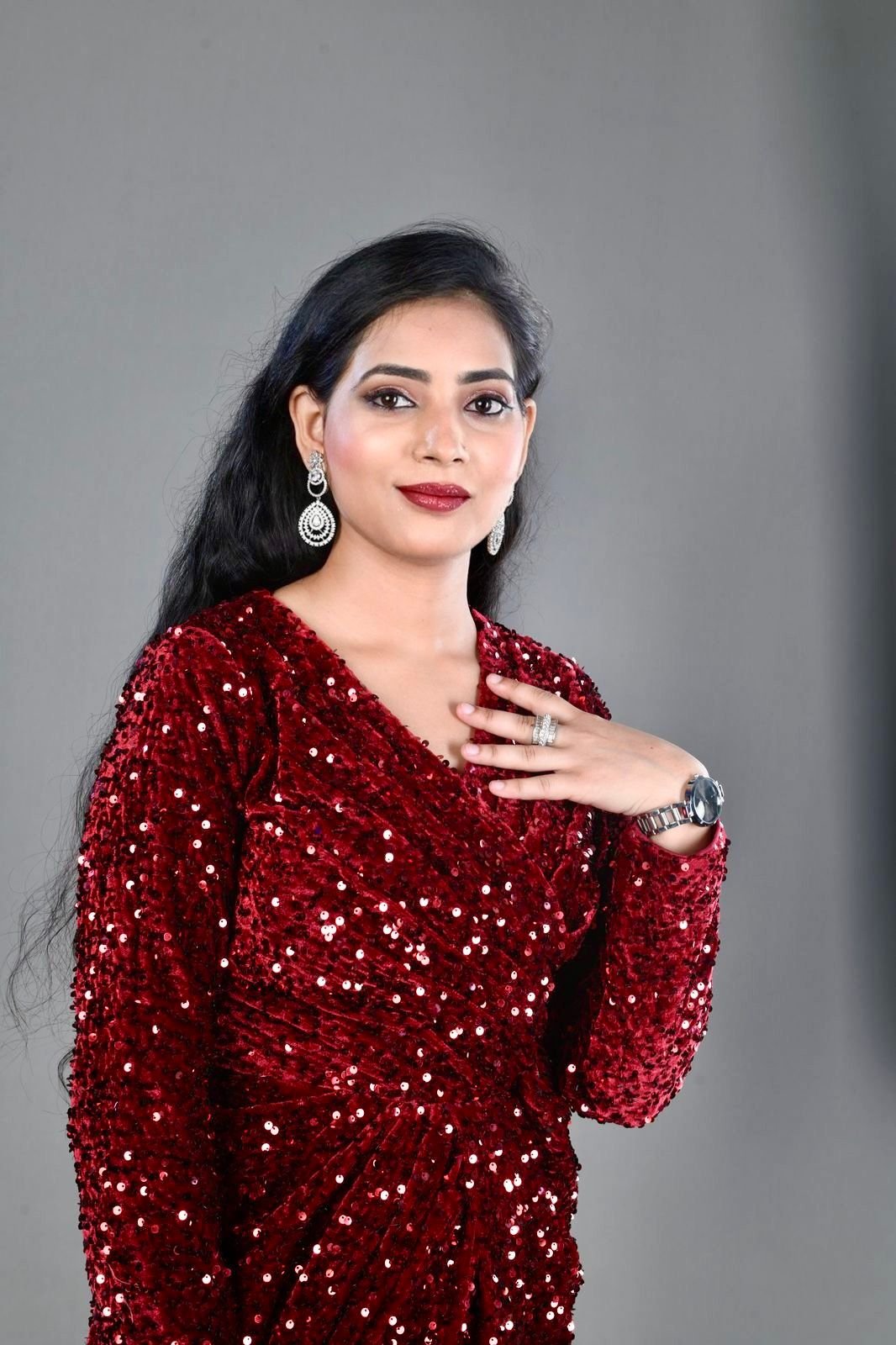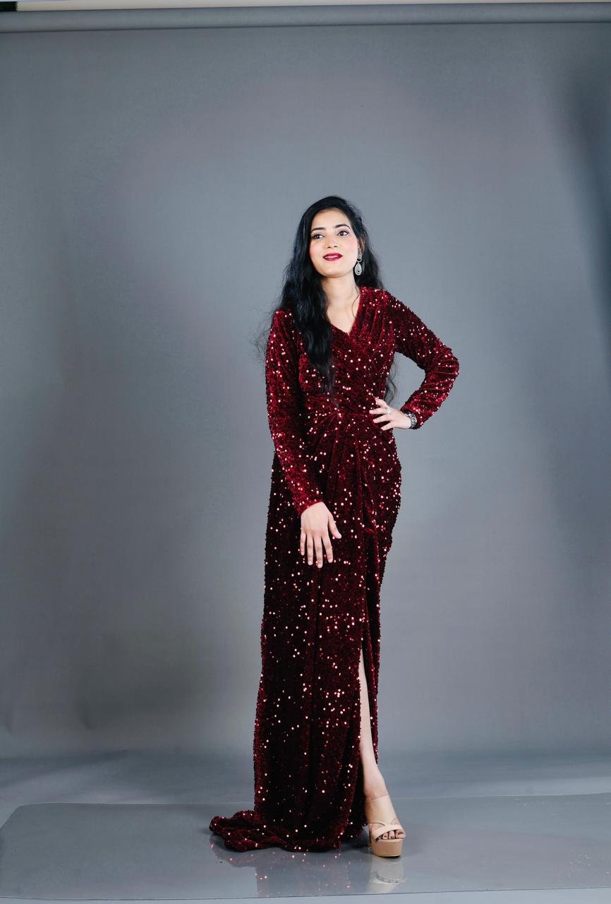 – Make a statement at every party with this stunning maroon sequence gown, perfect for showcasing your elegant side.