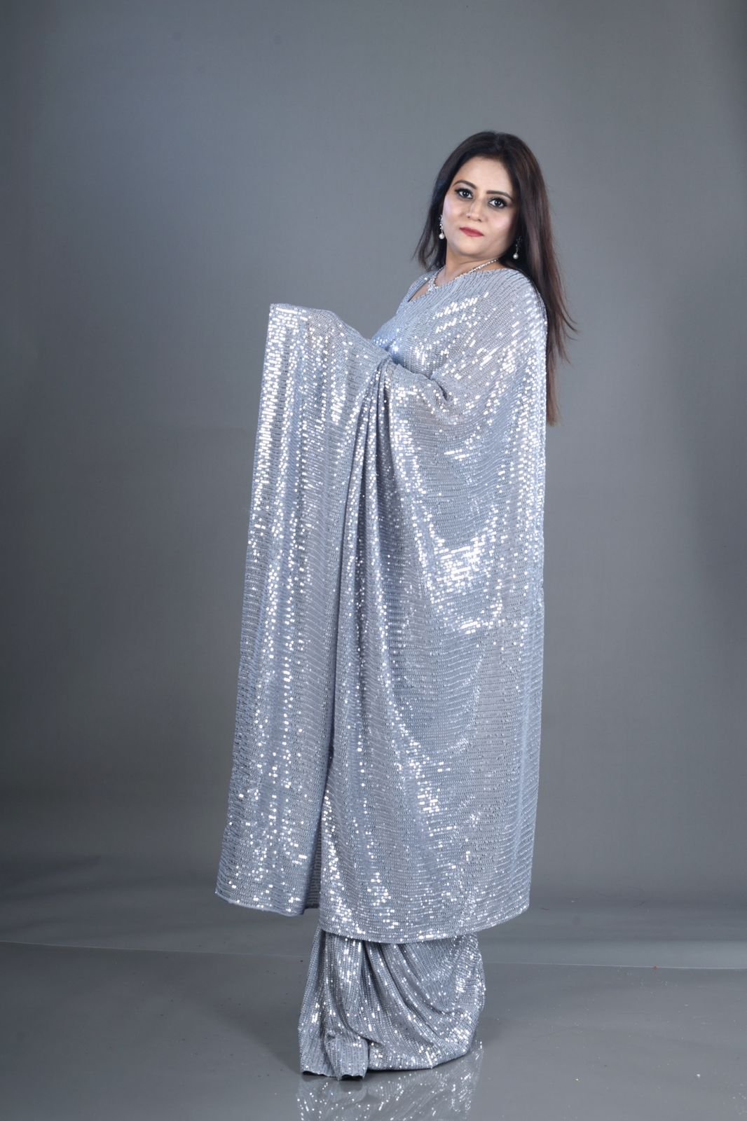 – Shine bright in this stunning silver sequins saree and blouse.
